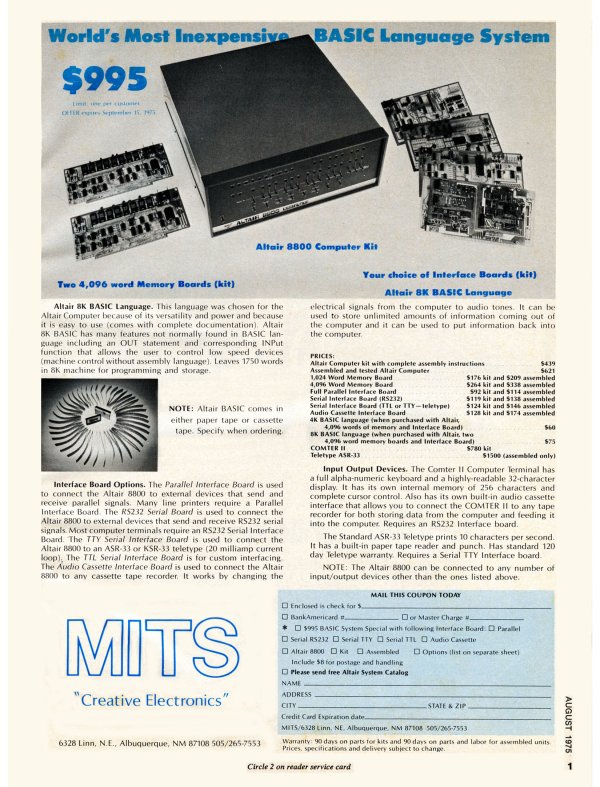 Lettre envoyée au Homebrew Computer Club, club d'informatique de la Silicon Valley. Parmi les passionnés qui s'y retrouvaient : Steve Wozniak (concepteur des premiers ordinateurs Apple jusqu'au Macintosh) et Steve Jobs.